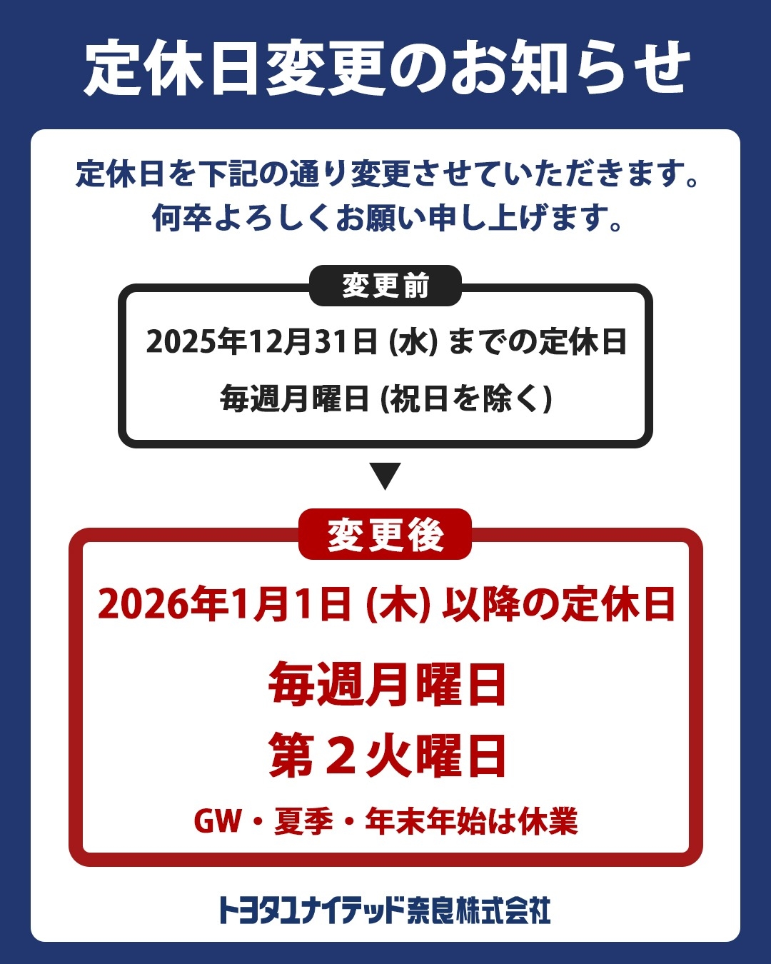 定休日変更のご案内【ネッツトヨタ奈良 新大宮店】