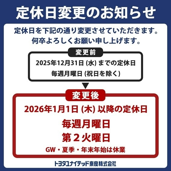 定休日変更のお知らせ【ネッツトヨタ奈良生駒店】 2025.11.11 ネッツ生駒店 N生駒店 2026年1月より 当店の定休日を下記の通り変更させていただくこととなりました。 お客様には大変ご不便をおかけすることと存じますが、 何卒ご理解賜りますようお願い申し上げます。 \\ MENU // 奈良トヨペット×ネッツトヨタ奈良 新車、試乗車・展示車検索は 下記をクリック 前の記事へ 店舗ブログ一覧に戻る 次の記事へ
