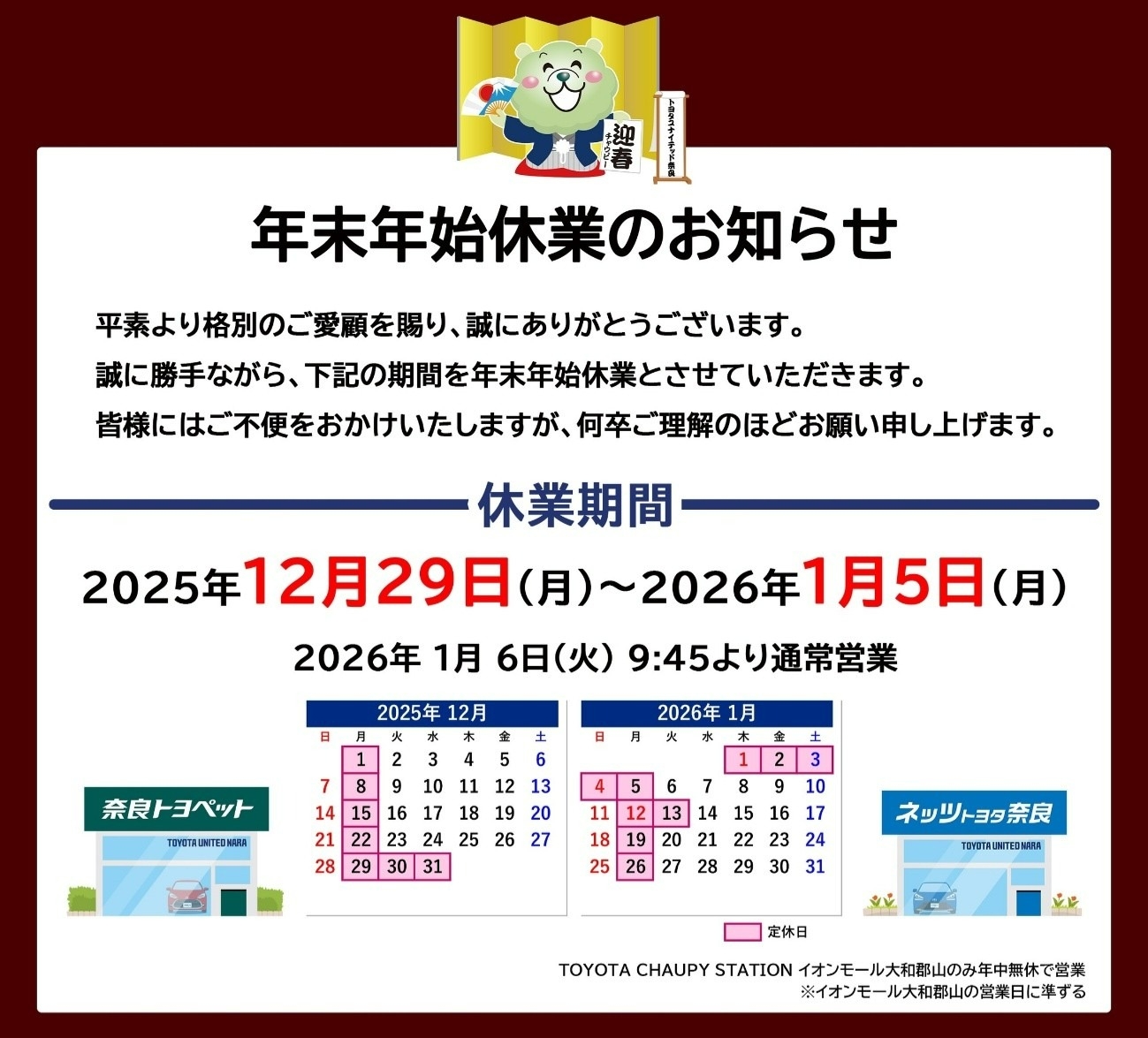 年末年始休業&工事のご案内【奈良トヨペット登美ヶ丘店】