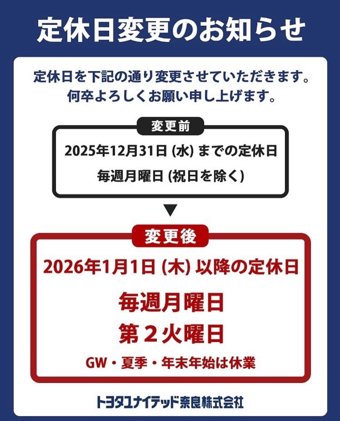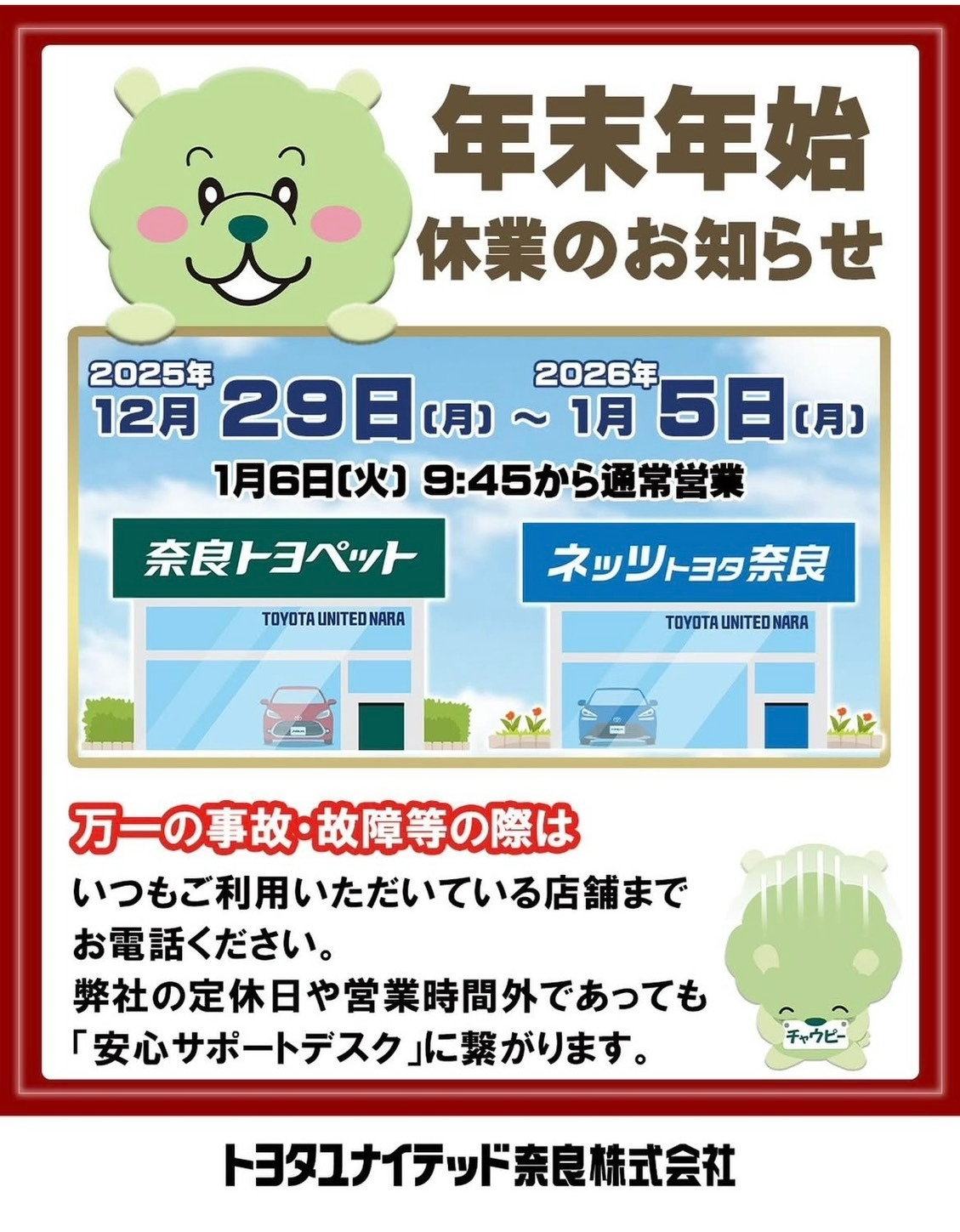 🎍年末年始休業のお知らせ🎍【奈良トヨペット橿原店】
