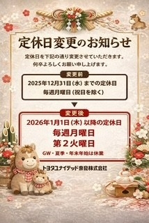🎍 新年のご挨拶 🎍【奈良トヨペット広陵店】 2026.01.10 P広陵店 トヨペット広陵店 あけましておめでとうございます。 本年もどうぞ宜しくお願い致します。 皆さま、お正月はいかがお過ごしでしたか? ご家族でのお出かけや、ゆっくりと過ごされた方も多いのではないでしょうか😊 今年は午年です🐎 何事も『うまくいく』一年になりますように・・・ 皆さまのカーライフも快走できるように全力でサポートいたします✨ ご来店の際は、点検や整備の待ち時間に、ぜひお正月のお出かけ話を 聞かせてくださいね♪ 本年もスタッフ一同、笑顔でお待ちしております😊 2026年も奈良トヨペット広陵店をどうぞよろしくお願いいたします✨ ※今年から定休日が変更になっておりますのでご注意下さい。 \\ MENU // 奈良トヨペット×ネッツトヨタ奈良 新車、試乗車・展示車検索は 下記をタップしてください 前の記事へ 店舗ブログ一覧に戻る 次の記事へ