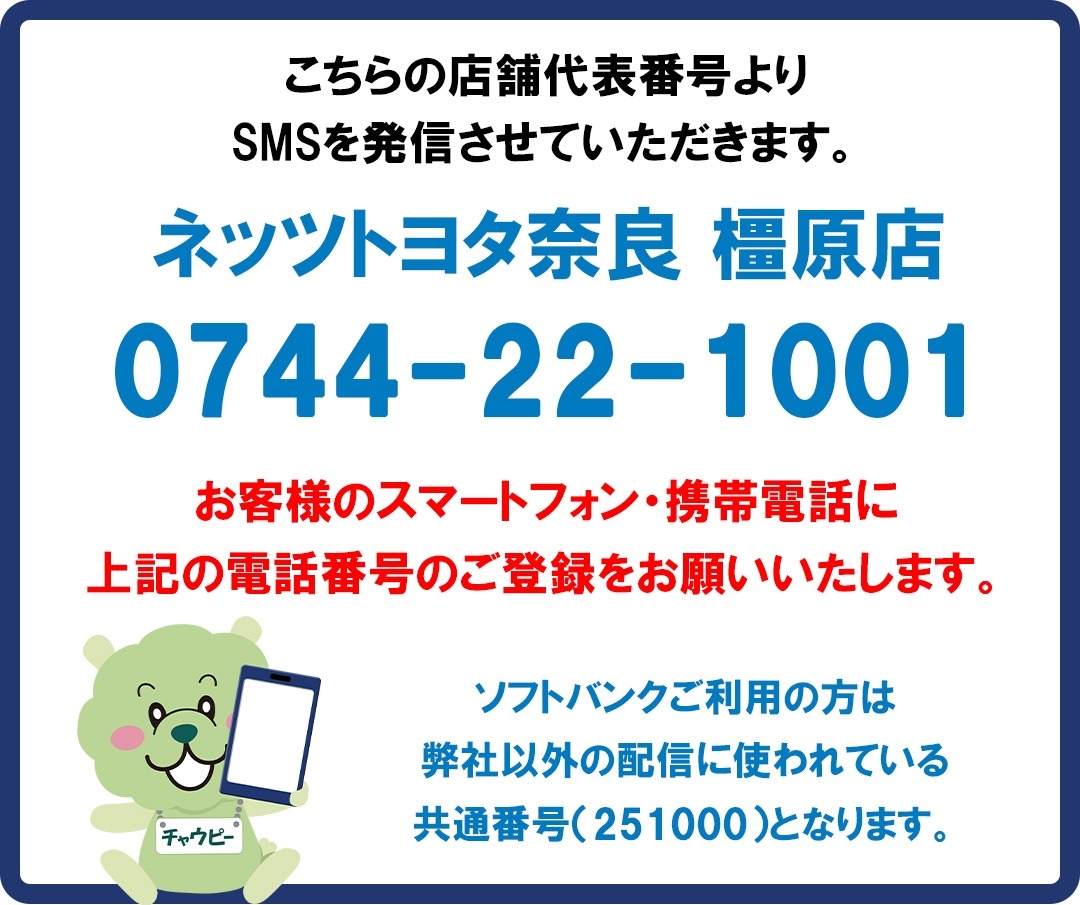 各種点検のご案内方法 変更のお知らせ 【ネッツトヨタ奈良 橿原店】 2026.02.06 N橿原店 いつもトヨタユナイテッド奈良をご利用いただき誠にありがとうございます。 昨今の環境意識の高まりを受け、従来は郵送にてお送りしておりました点検等のご案内ダイレクトメール(DM)を順次ショートメッセージサービス(SMS)でのご案内に変更させていただきます。 ご理解とご協力を賜りますようお願い申し上げます。 現在お送りしておりますハガキでのご案内は2026年11月をもって終了いたします。 ご不明な点等ございましたら、店舗までお問い合わせください。 前の記事へ 店舗ブログ一覧に戻る 次の記事へ