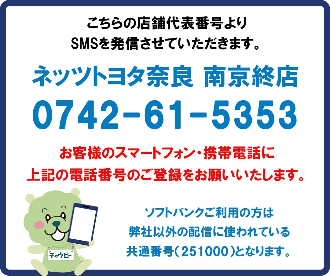 各種点検のご案内方法 変更のお知らせ 【ネッツトヨタ奈良 南京終店】 2026.02.06 N南京終店 いつもトヨタユナイテッド奈良をご利用いただき誠にありがとうございます。 昨今の環境意識の高まりを受け、従来は郵送にてお送りしておりました点検等のご案内ダイレクトメール(DM)を順次ショートメッセージサービス(SMS)でのご案内に変更させていただきます。 ご理解とご協力を賜りますようお願い申し上げます。 現在お送りしておりますハガキでのご案内は2026年11月をもって終了いたします。 ご不明な点等ございましたら、店舗までお問い合わせください。 前の記事へ 店舗ブログ一覧に戻る 次の記事へ
