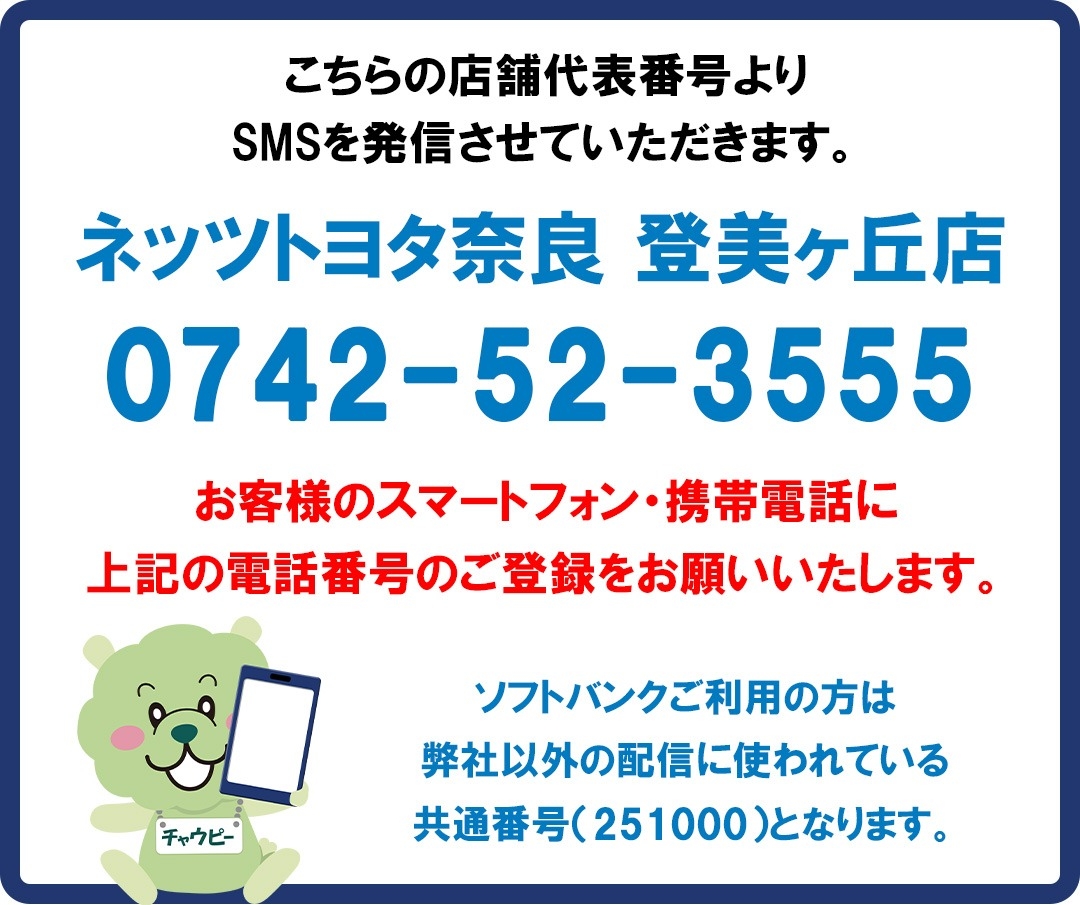 各種点検のご案内方法 変更のお知らせ 【ネッツトヨタ奈良 登美ヶ丘店】 2026.02.06 N登美ヶ丘店 いつもトヨタユナイテッド奈良をご利用いただき誠にありがとうございます。 昨今の環境意識の高まりを受け、従来は郵送にてお送りしておりました点検等のご案内ダイレクトメール(DM)を順次ショートメッセージサービス(SMS)でのご案内に変更させていただきます。 ご理解とご協力を賜りますようお願い申し上げます。 現在お送りしておりますハガキでのご案内は2026年11月をもって終了いたします。 ご不明な点等ございましたら、店舗までお問い合わせください。 前の記事へ 店舗ブログ一覧に戻る 次の記事へ
