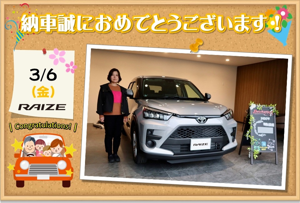 ライズを選んでいただきありがとうございます。とても運転しやすいお車ですので安心してドライブして下さい。