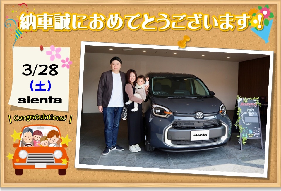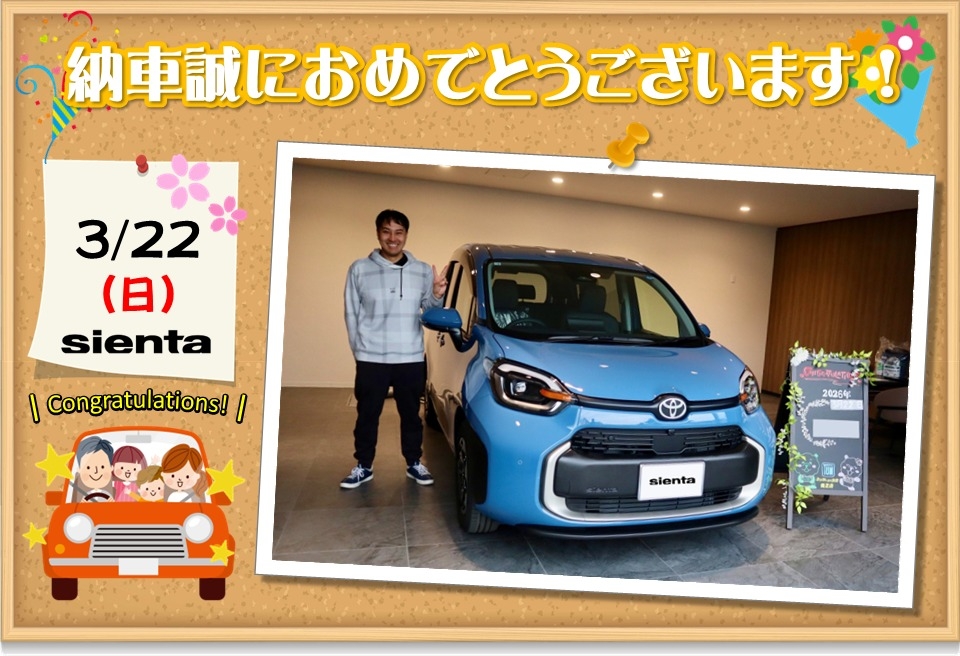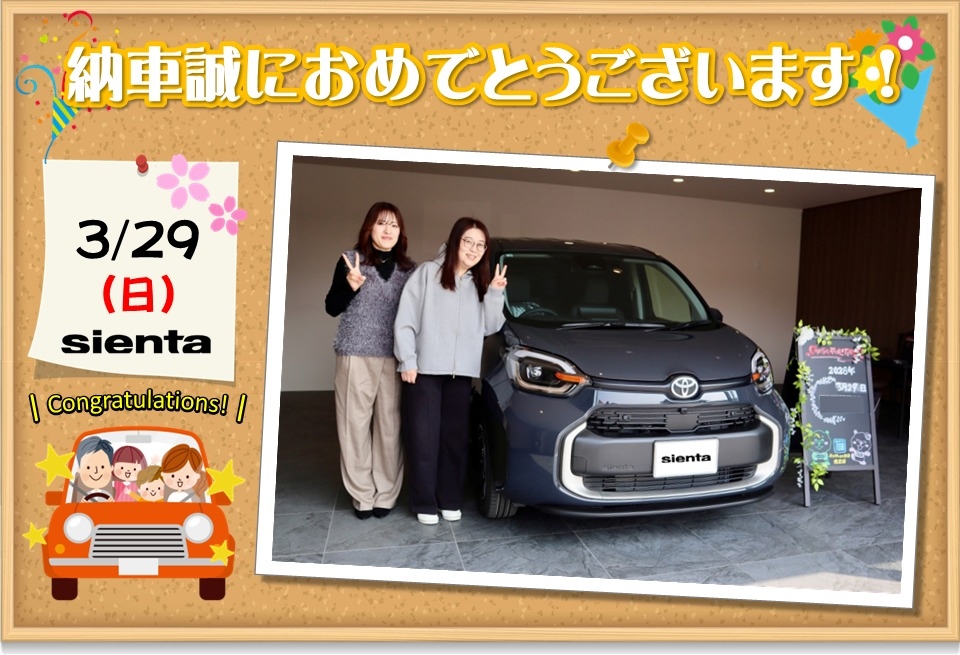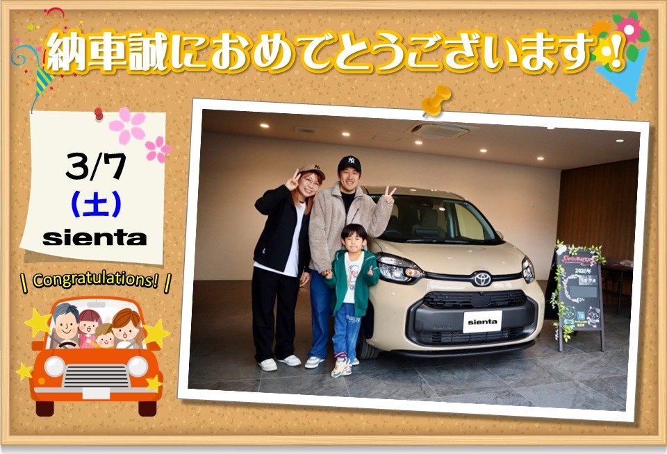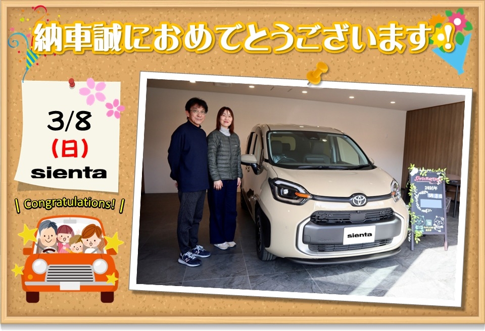 ご納車おめでとうございます。ベージュの可愛いシエンタでドライブを楽しんでください。