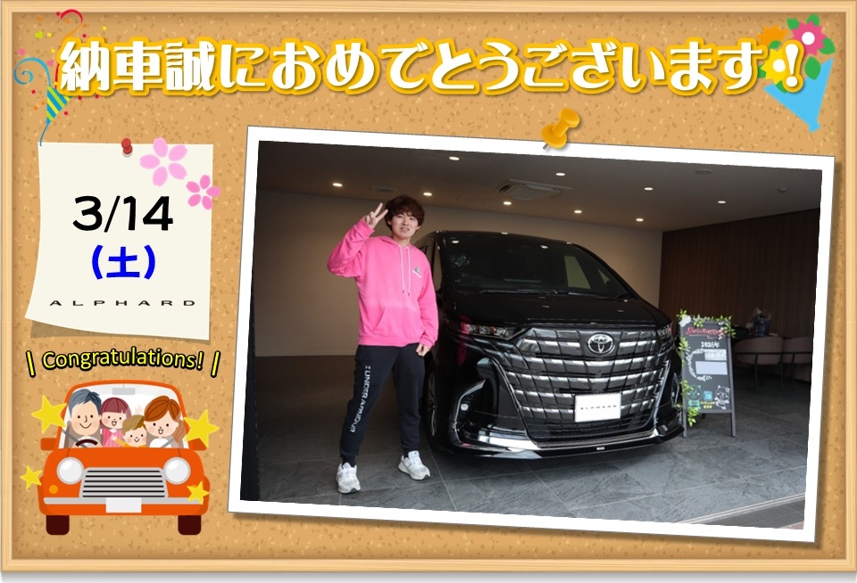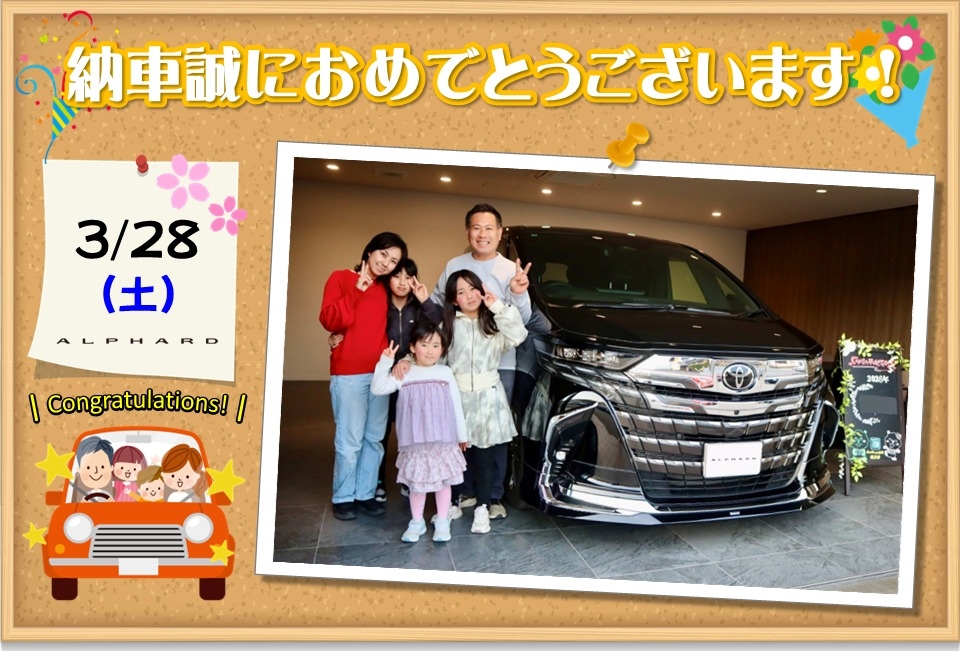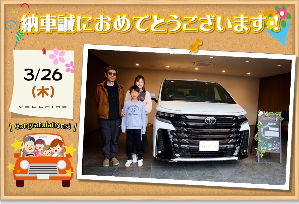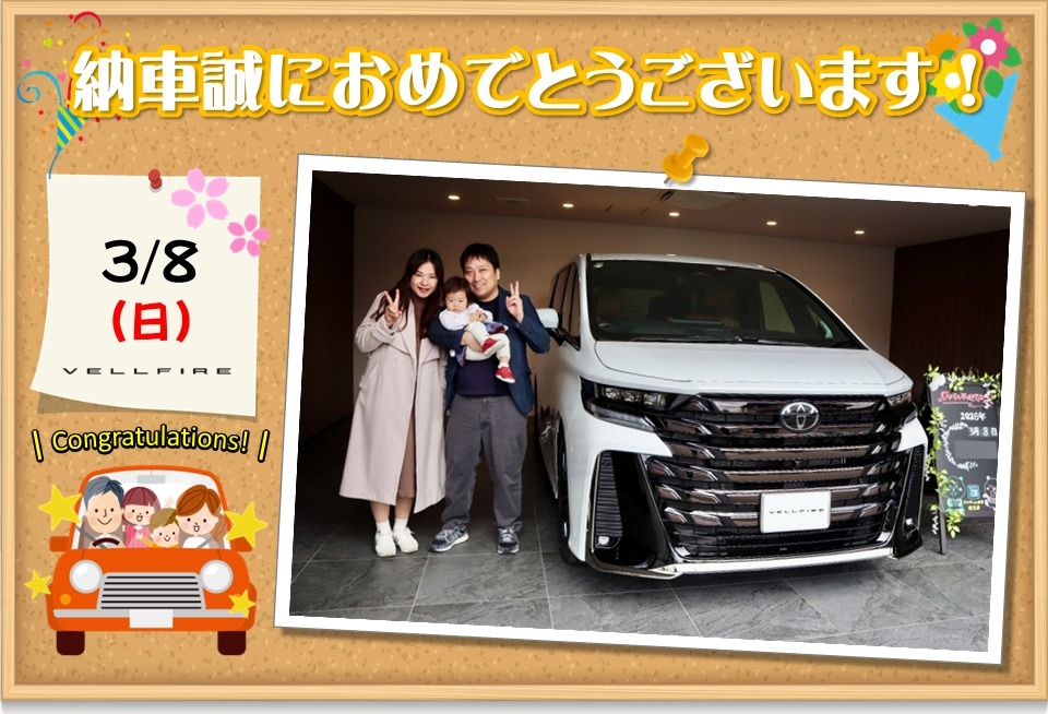 楽しみにしてくださっていた待望のヴェルファイアですね。是非色々な所へご家族そろってお出かけ下さい。