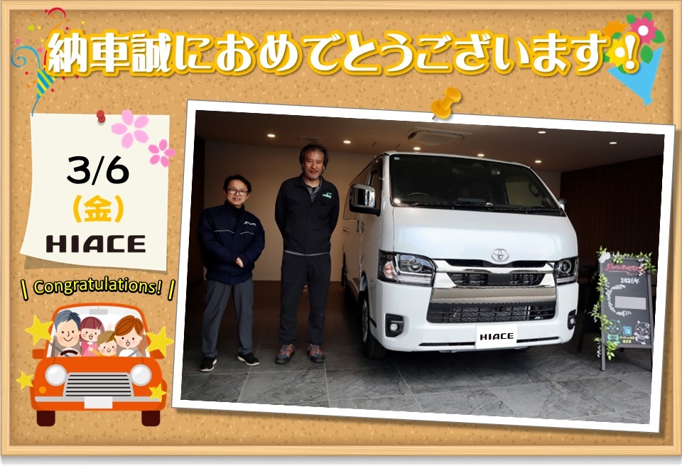 ご納車おめでとうございます。新型ハイエースで安心・安全なカーライフをお過ごしください。