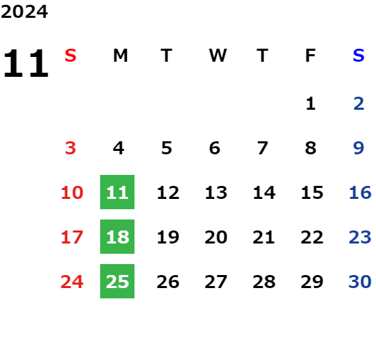 毎週月曜日(祝日を除く)